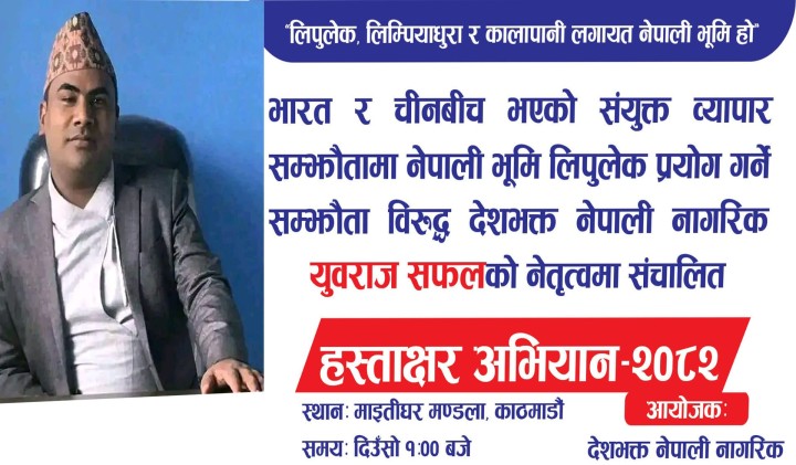 भारत र चिनबीच व्यापार सम्झौतामा नेपाली भूमि लिपुलेक प्रयोग गर्ने सम्झौता विरुद्ध हस्ताक्षर अभियान शुरु